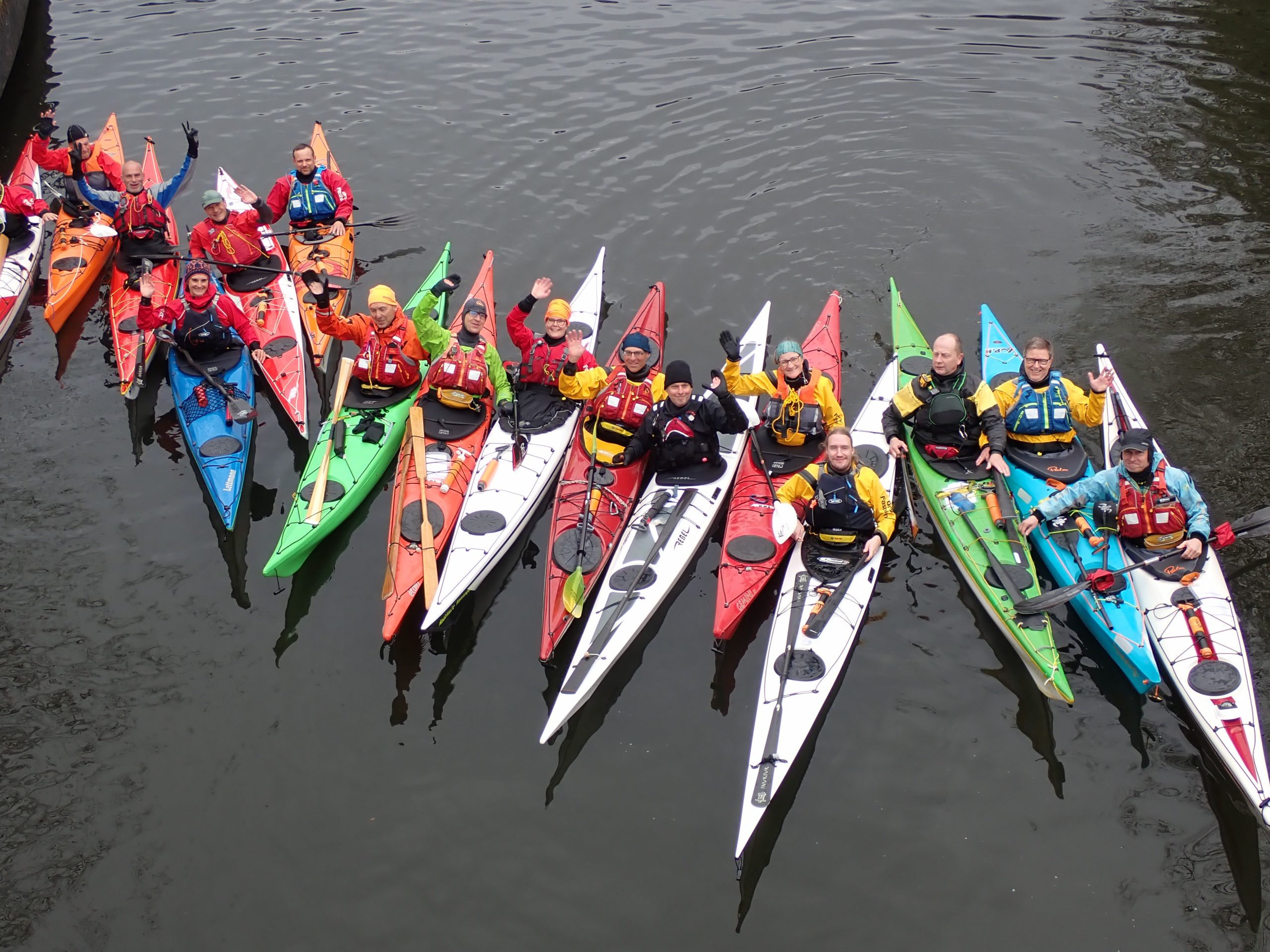 Obwohl die Alster noch sehr kalt war, stürzten sich alle lebhaft in die Fluten, manchmal auch versehentlich durch engagiertes Üben beim Kanten und Steuerschlägen. Die Rettungstechniken und Rollen wurden vorgeführt, einige Teilnehmer nutzten sogar beim All-In Reentry-and-Roll.