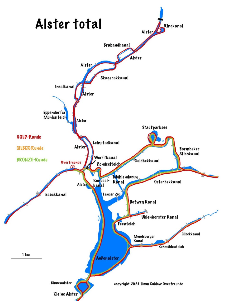 Gold-Tour 40 km: Alster total über alle Kanäle zwischen Rathaus und Fuhlsbüttel (Start 9.00 Uhr auf dem Wasser, Startvorbereitung ab 8.00 Uhr, schnelles