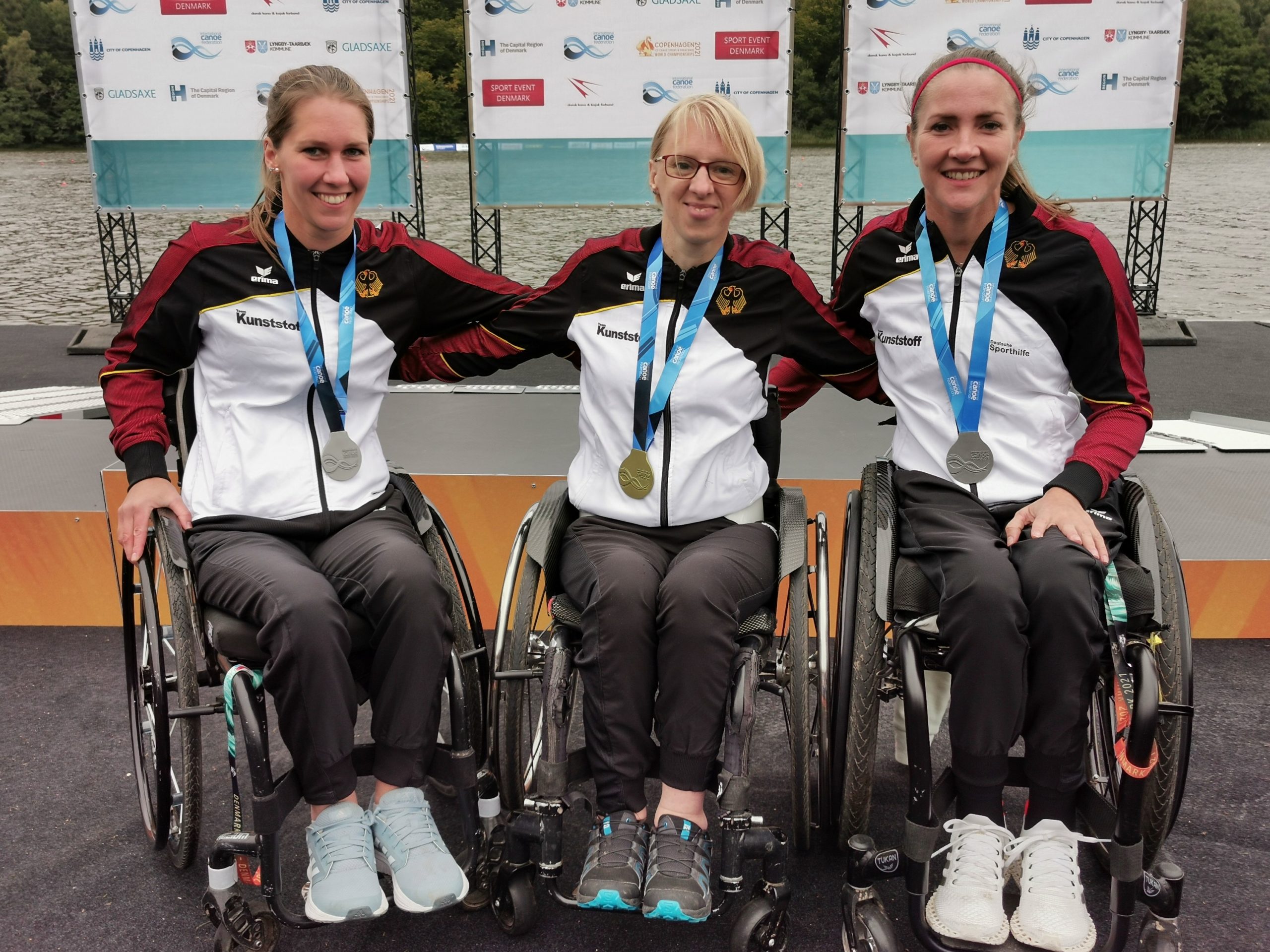 Der erste Wettkampftag der Weltmeisterschaften in Kopenhagen endete für die deutschen Parakanuten mit zwei Medaillen in der Startklasse Vl 1 Damen. Auf dem Bagsvaerd See fuhr Lillemor Köper souverän zum Sieg. Ihre Vereinskameradin vom Hamburger KC, Esther Bode, kam auf den zweiten Platz vor der Paddlerin aus Frankreich. Die guten Wetterbedingungen heute halfen den Athletinnen, die ihr Boot nur mit den Armen und Schultern paddeln können. Denn der Va´a ist für sie bei Wind schwierig zu steuern. „Das war richtig großes Kino.“ So der Bundestrainer André Brendel nach dem Rennen. „Beide Sportlerinnen haben sich richtig gut verkauft. Lillemor Köper zeigte gute Nerven, als sie ihr Boot am Start nochmal ausrichten musste. Auch wenn Esther Bode einige Bogenschläge machen musste, um ihr Boot in der Bahn zu halten, hat sie ihren zweiten Platz gut herausgefahren.“ Die 37-jährige Rollstuhlfahrerin sagt zu ihrem Erfolg: „Ich find es total cool. Es war ein echt gutes Rennen, am Start war ich super weggekommen.“„Besser Gold bei den Paralympics und Silber hier, als umgedreht.“ War der Kommentar von Edina Müller zum Gewinn der Silbermedaille in der Startklasse Kl 1 bei den Weltmeisterschaften in Kopenhagen. In einer Neuauflage des paralympischen Finales bezwang diesmal Maryna Mazhula aus der Ukraine die 38-jährige Hamburgerin. Katherine Wollerman aus Chile wurde wieder Dritte. Foto: Andre Brendel Text: Christel Schlisio